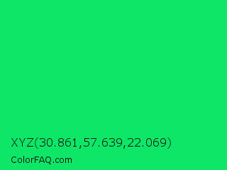 XYZ 30.861,57.639,22.069 Color is a normal green color and the nearest color is Malachite #0bda51. Hex code #0de666 and RGB value is rgb(13,230,102). In RGB color space, this color is composed of 5% red, 90% green, 40% blue, In CMYK color space, this color is composed of 94% cyan, 0% magenta, 56% yellow , 10% black , In HSL color space, this color has a hue angle of 145° , 89% saturation and 48% lightness.