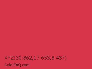 XYZ 30.862,17.653,8.437 Color is a normal red color and the nearest color is Rusty Red #da2c43. Hex code #d8354b and RGB value is rgb(216,53,75). In RGB color space, this color is composed of 85% red, 21% green, 29% blue, In CMYK color space, this color is composed of 0% cyan, 75% magenta, 65% yellow , 15% black , In HSL color space, this color has a hue angle of 352° , 68% saturation and 53% lightness.