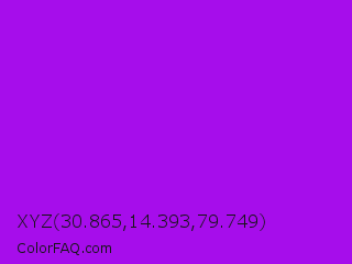 XYZ 30.865,14.393,79.749 Color is a normal purple color and the nearest color is Vivid Mulberry #b80ce3. Hex code #a60deb and RGB value is rgb(166,13,235). In RGB color space, this color is composed of 65% red, 5% green, 92% blue, In CMYK color space, this color is composed of 29% cyan, 94% magenta, 0% yellow , 8% black , In HSL color space, this color has a hue angle of 281° , 90% saturation and 49% lightness.