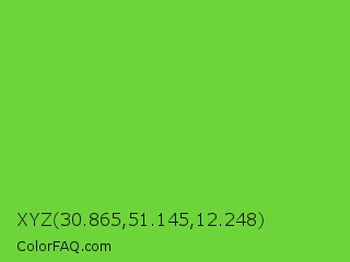 XYZ 30.865,51.145,12.248 Color is a normal green color and the nearest color is Kiwi #8ee53f. Hex code #6dd53a and RGB value is rgb(109,213,58). In RGB color space, this color is composed of 43% red, 84% green, 23% blue, In CMYK color space, this color is composed of 49% cyan, 0% magenta, 73% yellow , 16% black , In HSL color space, this color has a hue angle of 100° , 65% saturation and 53% lightness.