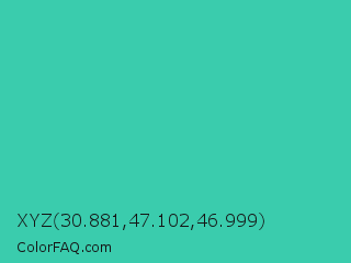 XYZ 30.881,47.102,46.999 Color is a normal cyan color and the nearest color is Puerto Rico #3fc1aa. Hex code #3accad and RGB value is rgb(58,204,173). In RGB color space, this color is composed of 23% red, 80% green, 68% blue, In CMYK color space, this color is composed of 72% cyan, 0% magenta, 15% yellow , 20% black , In HSL color space, this color has a hue angle of 167° , 59% saturation and 51% lightness.