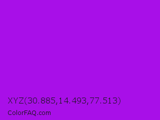 XYZ 30.885,14.493,77.513 Color is a normal purple color and the nearest color is Vivid Mulberry #b80ce3. Hex code #a80fe8 and RGB value is rgb(168,15,232). In RGB color space, this color is composed of 66% red, 6% green, 91% blue, In CMYK color space, this color is composed of 28% cyan, 94% magenta, 0% yellow , 9% black , In HSL color space, this color has a hue angle of 282° , 88% saturation and 48% lightness.