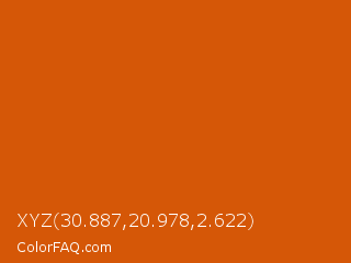 XYZ 30.887,20.978,2.622 Color is a normal orange color and the nearest color is Red Stage #d05f04. Hex code #d55707 and RGB value is rgb(213,87,7). In RGB color space, this color is composed of 84% red, 34% green, 3% blue, In CMYK color space, this color is composed of 0% cyan, 59% magenta, 97% yellow , 16% black , In HSL color space, this color has a hue angle of 23° , 94% saturation and 43% lightness.