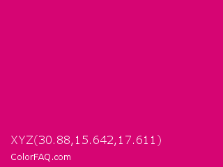 XYZ 30.88,15.642,17.611 Color is a normal rose color and the nearest color is Red Purple #e40078. Hex code #d60573 and RGB value is rgb(214,5,115). In RGB color space, this color is composed of 84% red, 2% green, 45% blue, In CMYK color space, this color is composed of 0% cyan, 98% magenta, 46% yellow , 16% black , In HSL color space, this color has a hue angle of 328° , 95% saturation and 43% lightness.