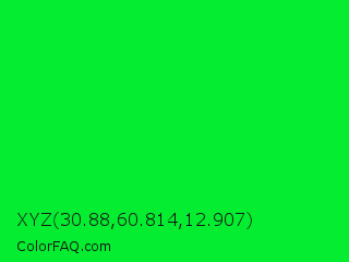 XYZ 30.88,60.814,12.907 Color is a normal green color and the nearest color is Vivid Malachite #00cc33. Hex code #05ed30 and RGB value is rgb(5,237,48). In RGB color space, this color is composed of 2% red, 93% green, 19% blue, In CMYK color space, this color is composed of 98% cyan, 0% magenta, 80% yellow , 7% black , In HSL color space, this color has a hue angle of 131° , 96% saturation and 47% lightness.