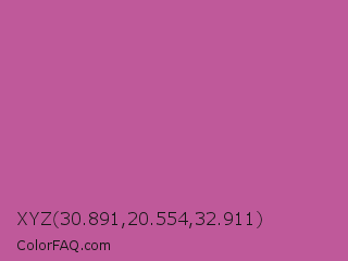 XYZ 30.891,20.554,32.911 Color is a normal magenta color and the nearest color is Pearly Purple #b768a2. Hex code #bf599a and RGB value is rgb(191,89,154). In RGB color space, this color is composed of 75% red, 35% green, 60% blue, In CMYK color space, this color is composed of 0% cyan, 53% magenta, 19% yellow , 25% black , In HSL color space, this color has a hue angle of 322° , 44% saturation and 55% lightness.