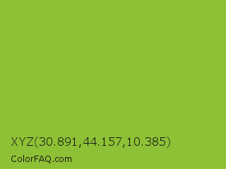 XYZ 30.891,44.157,10.385 Color is a normal green color and the nearest color is Yellow Green #9acd32. Hex code #8ec136 and RGB value is rgb(142,193,54). In RGB color space, this color is composed of 56% red, 76% green, 21% blue, In CMYK color space, this color is composed of 26% cyan, 0% magenta, 72% yellow , 24% black , In HSL color space, this color has a hue angle of 82° , 56% saturation and 48% lightness.