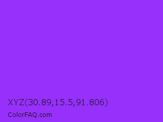XYZ 30.89,15.5,91.806 Color is a normal violet color and the nearest color is Veronica #a020f0. Hex code #9630fa and RGB value is rgb(150,48,250). In RGB color space, this color is composed of 59% red, 19% green, 98% blue, In CMYK color space, this color is composed of 40% cyan, 81% magenta, 0% yellow , 2% black , In HSL color space, this color has a hue angle of 270° , 95% saturation and 58% lightness.