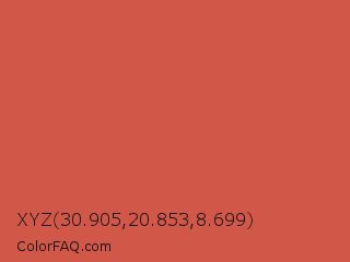 XYZ 30.905,20.853,8.699 Color is a normal red color and the nearest color is Dark Coral #cd5b45. Hex code #d15749 and RGB value is rgb(209,87,73). In RGB color space, this color is composed of 82% red, 34% green, 29% blue, In CMYK color space, this color is composed of 0% cyan, 58% magenta, 65% yellow , 18% black , In HSL color space, this color has a hue angle of 6° , 60% saturation and 55% lightness.