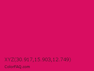 XYZ 30.917,15.903,12.749 Color is a normal rose color and the nearest color is Ruby #e0115f. Hex code #d90d61 and RGB value is rgb(217,13,97). In RGB color space, this color is composed of 85% red, 5% green, 38% blue, In CMYK color space, this color is composed of 0% cyan, 94% magenta, 55% yellow , 15% black , In HSL color space, this color has a hue angle of 335° , 89% saturation and 45% lightness.