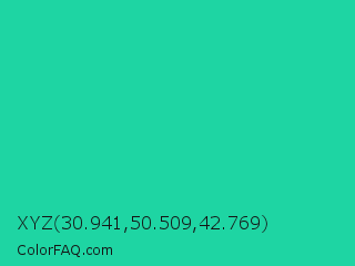 XYZ 30.941,50.509,42.769 Color is a normal cyan color and the nearest color is Shamrock #33cc99. Hex code #1ed5a3 and RGB value is rgb(30,213,163). In RGB color space, this color is composed of 12% red, 84% green, 64% blue, In CMYK color space, this color is composed of 86% cyan, 0% magenta, 23% yellow , 16% black , In HSL color space, this color has a hue angle of 164° , 75% saturation and 48% lightness.