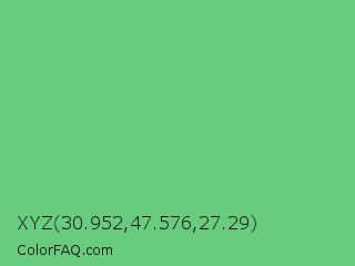 XYZ 30.952,47.576,27.29 Color is a normal green color and the nearest color is Iguana Green #71bc78. Hex code #67cc7e and RGB value is rgb(103,204,126). In RGB color space, this color is composed of 40% red, 80% green, 49% blue, In CMYK color space, this color is composed of 50% cyan, 0% magenta, 38% yellow , 20% black , In HSL color space, this color has a hue angle of 134° , 50% saturation and 60% lightness.
