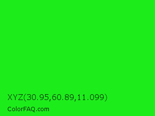 XYZ 30.95,60.89,11.099 Color is a normal green color and the nearest color is Neon Green #39ff14. Hex code #1ced1a and RGB value is rgb(28,237,26). In RGB color space, this color is composed of 11% red, 93% green, 10% blue, In CMYK color space, this color is composed of 88% cyan, 0% magenta, 89% yellow , 7% black , In HSL color space, this color has a hue angle of 119° , 85% saturation and 52% lightness.