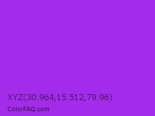 XYZ 30.964,15.512,79.96 Color is a normal purple color and the nearest color is Veronica #a020f0. Hex code #a32beb and RGB value is rgb(163,43,235). In RGB color space, this color is composed of 64% red, 17% green, 92% blue, In CMYK color space, this color is composed of 31% cyan, 82% magenta, 0% yellow , 8% black , In HSL color space, this color has a hue angle of 278° , 83% saturation and 55% lightness.