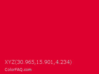 XYZ 30.965,15.901,4.234 Color is a normal red color and the nearest color is Medium Candy Apple Red #e2062c. Hex code #df0030 and RGB value is rgb(223,0,48). In RGB color space, this color is composed of 87% red, 0% green, 19% blue, In CMYK color space, this color is composed of 0% cyan, 100% magenta, 78% yellow , 13% black , In HSL color space, this color has a hue angle of 347° , 100% saturation and 44% lightness.
