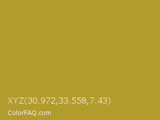 XYZ 30.972,33.558,7.43 Color is a normal yellow color and the nearest color is Alpine #af8f2c. Hex code #b39c2e and RGB value is rgb(179,156,46). In RGB color space, this color is composed of 70% red, 61% green, 18% blue, In CMYK color space, this color is composed of 0% cyan, 13% magenta, 74% yellow , 30% black , In HSL color space, this color has a hue angle of 50° , 59% saturation and 44% lightness.