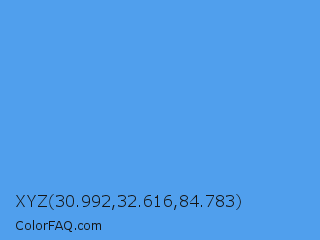 XYZ 30.992,32.616,84.783 Color is a light blue color and the nearest color is United Nations Blue #5b92e5. Hex code #509fed and RGB value is rgb(80,159,237). In RGB color space, this color is composed of 31% red, 62% green, 93% blue, In CMYK color space, this color is composed of 66% cyan, 33% magenta, 0% yellow , 7% black , In HSL color space, this color has a hue angle of 210° , 81% saturation and 62% lightness.