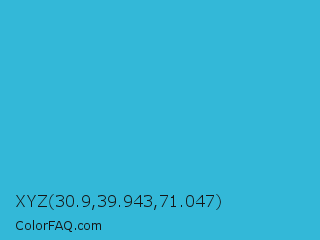 XYZ 30.9,39.943,71.047 Color is a normal cyan color and the nearest color is Scooter #2ebfd4. Hex code #33b8d8 and RGB value is rgb(51,184,216). In RGB color space, this color is composed of 20% red, 72% green, 85% blue, In CMYK color space, this color is composed of 76% cyan, 15% magenta, 0% yellow , 15% black , In HSL color space, this color has a hue angle of 192° , 68% saturation and 52% lightness.