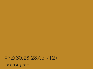 XYZ 30,28.287,5.712 Color is a normal orange color and the nearest color is University Of California Gold #b78727. Hex code #bd8726 and RGB value is rgb(189,135,38). In RGB color space, this color is composed of 74% red, 53% green, 15% blue, In CMYK color space, this color is composed of 0% cyan, 29% magenta, 80% yellow , 26% black , In HSL color space, this color has a hue angle of 39° , 67% saturation and 45% lightness.