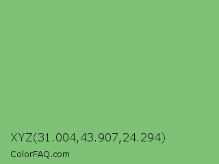 XYZ 31.004,43.907,24.294 Color is a light green color and the nearest color is Iguana Green #71bc78. Hex code #7ec177 and RGB value is rgb(126,193,119). In RGB color space, this color is composed of 49% red, 76% green, 47% blue, In CMYK color space, this color is composed of 35% cyan, 0% magenta, 38% yellow , 24% black , In HSL color space, this color has a hue angle of 114° , 37% saturation and 61% lightness.