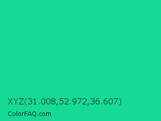 XYZ 31.008,52.972,36.607 Color is a normal green color and the nearest color is Caribbean Green #00cc99. Hex code #16db94 and RGB value is rgb(22,219,148). In RGB color space, this color is composed of 9% red, 86% green, 58% blue, In CMYK color space, this color is composed of 90% cyan, 0% magenta, 32% yellow , 14% black , In HSL color space, this color has a hue angle of 158° , 82% saturation and 47% lightness.