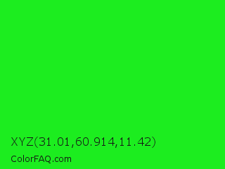 XYZ 31.01,60.914,11.42 Color is a normal green color and the nearest color is Neon Green #39ff14. Hex code #1ced1f and RGB value is rgb(28,237,31). In RGB color space, this color is composed of 11% red, 93% green, 12% blue, In CMYK color space, this color is composed of 88% cyan, 0% magenta, 87% yellow , 7% black , In HSL color space, this color has a hue angle of 121° , 85% saturation and 52% lightness.