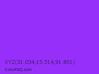 XYZ 31.034,15.514,91.801 Color is a normal purple color and the nearest color is Veronica #a020f0. Hex code #972ffa and RGB value is rgb(151,47,250). In RGB color space, this color is composed of 59% red, 18% green, 98% blue, In CMYK color space, this color is composed of 40% cyan, 81% magenta, 0% yellow , 2% black , In HSL color space, this color has a hue angle of 271° , 95% saturation and 58% lightness.