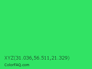 XYZ 31.036,56.511,21.329 Color is a normal green color and the nearest color is UFO Green #3cd070. Hex code #31e364 and RGB value is rgb(49,227,100). In RGB color space, this color is composed of 19% red, 89% green, 39% blue, In CMYK color space, this color is composed of 78% cyan, 0% magenta, 56% yellow , 11% black , In HSL color space, this color has a hue angle of 137° , 76% saturation and 54% lightness.