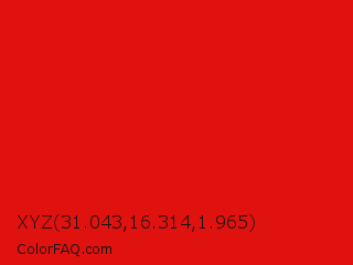 XYZ 31.043,16.314,1.965 Color is a normal red color and the nearest color is KU Crimson #e8000d. Hex code #e0120f and RGB value is rgb(224,18,15). In RGB color space, this color is composed of 88% red, 7% green, 6% blue, In CMYK color space, this color is composed of 0% cyan, 92% magenta, 93% yellow , 12% black , In HSL color space, this color has a hue angle of 1° , 87% saturation and 47% lightness.