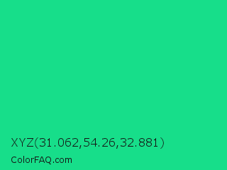 XYZ 31.062,54.26,32.881 Color is a normal green color and the nearest color is Caribbean Green #00cc99. Hex code #17de8a and RGB value is rgb(23,222,138). In RGB color space, this color is composed of 9% red, 87% green, 54% blue, In CMYK color space, this color is composed of 90% cyan, 0% magenta, 38% yellow , 13% black , In HSL color space, this color has a hue angle of 155° , 81% saturation and 48% lightness.