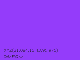 XYZ 31.084,16.43,91.975 Color is a light violet color and the nearest color is Navy Purple #9457eb. Hex code #943cfa and RGB value is rgb(148,60,250). In RGB color space, this color is composed of 58% red, 24% green, 98% blue, In CMYK color space, this color is composed of 41% cyan, 76% magenta, 0% yellow , 2% black , In HSL color space, this color has a hue angle of 268° , 95% saturation and 61% lightness.