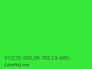 XYZ 31.092,58.783,13.449 Color is a normal green color and the nearest color is Lime Green #32cd32. Hex code #36e838 and RGB value is rgb(54,232,56). In RGB color space, this color is composed of 21% red, 91% green, 22% blue, In CMYK color space, this color is composed of 77% cyan, 0% magenta, 76% yellow , 9% black , In HSL color space, this color has a hue angle of 121° , 79% saturation and 56% lightness.