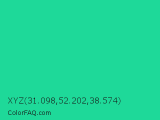 XYZ 31.098,52.202,38.574 Color is a normal green color and the nearest color is Shamrock #33cc99. Hex code #1ed999 and RGB value is rgb(30,217,153). In RGB color space, this color is composed of 12% red, 85% green, 60% blue, In CMYK color space, this color is composed of 86% cyan, 0% magenta, 29% yellow , 15% black , In HSL color space, this color has a hue angle of 159° , 76% saturation and 48% lightness.
