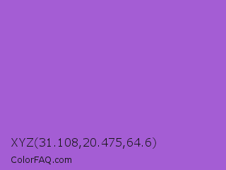 XYZ 31.108,20.475,64.6 Color is a normal purple color and the nearest color is Rich Lavender #a76bcf. Hex code #a45dd4 and RGB value is rgb(164,93,212). In RGB color space, this color is composed of 64% red, 36% green, 83% blue, In CMYK color space, this color is composed of 23% cyan, 56% magenta, 0% yellow , 17% black , In HSL color space, this color has a hue angle of 276° , 58% saturation and 60% lightness.