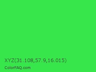 XYZ 31.108,57.9,16.015 Color is a normal green color and the nearest color is Lime Green #32cd32. Hex code #37e64a and RGB value is rgb(55,230,74). In RGB color space, this color is composed of 22% red, 90% green, 29% blue, In CMYK color space, this color is composed of 76% cyan, 0% magenta, 68% yellow , 10% black , In HSL color space, this color has a hue angle of 127° , 78% saturation and 56% lightness.