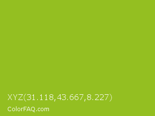 XYZ 31.118,43.667,8.227 Color is a normal lime color and the nearest color is Atlantis #97cd2d. Hex code #94bf21 and RGB value is rgb(148,191,33). In RGB color space, this color is composed of 58% red, 75% green, 13% blue, In CMYK color space, this color is composed of 23% cyan, 0% magenta, 83% yellow , 25% black , In HSL color space, this color has a hue angle of 76° , 71% saturation and 44% lightness.