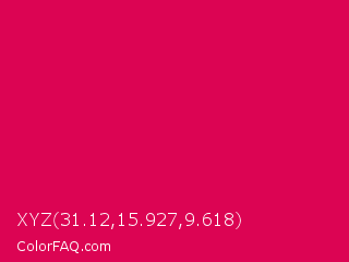 XYZ 31.12,15.927,9.618 Color is a normal rose color and the nearest color is Debian Red #d70a53. Hex code #dc0453 and RGB value is rgb(220,4,83). In RGB color space, this color is composed of 86% red, 2% green, 33% blue, In CMYK color space, this color is composed of 0% cyan, 98% magenta, 62% yellow , 14% black , In HSL color space, this color has a hue angle of 338° , 96% saturation and 44% lightness.