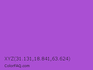XYZ 31.131,18.841,63.624 Color is a normal purple color and the nearest color is Medium Orchid #ba55d3. Hex code #aa4fd3 and RGB value is rgb(170,79,211). In RGB color space, this color is composed of 67% red, 31% green, 83% blue, In CMYK color space, this color is composed of 19% cyan, 63% magenta, 0% yellow , 17% black , In HSL color space, this color has a hue angle of 281° , 60% saturation and 57% lightness.