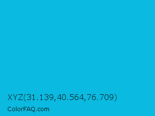 XYZ 31.139,40.564,76.709 Color is a normal cyan color and the nearest color is Cyan Process #00b7eb. Hex code #0abae0 and RGB value is rgb(10,186,224). In RGB color space, this color is composed of 4% red, 73% green, 88% blue, In CMYK color space, this color is composed of 96% cyan, 17% magenta, 0% yellow , 12% black , In HSL color space, this color has a hue angle of 191° , 91% saturation and 46% lightness.