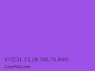 XYZ 31.13,18.766,76.844 Color is a light purple color and the nearest color is Navy Purple #9457eb. Hex code #9d51e6 and RGB value is rgb(157,81,230). In RGB color space, this color is composed of 62% red, 32% green, 90% blue, In CMYK color space, this color is composed of 32% cyan, 65% magenta, 0% yellow , 10% black , In HSL color space, this color has a hue angle of 271° , 75% saturation and 61% lightness.