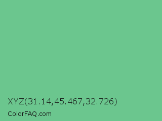 XYZ 31.14,45.467,32.726 Color is a normal green color and the nearest color is De York #7ac488. Hex code #6bc68e and RGB value is rgb(107,198,142). In RGB color space, this color is composed of 42% red, 78% green, 56% blue, In CMYK color space, this color is composed of 46% cyan, 0% magenta, 28% yellow , 22% black , In HSL color space, this color has a hue angle of 143° , 44% saturation and 60% lightness.