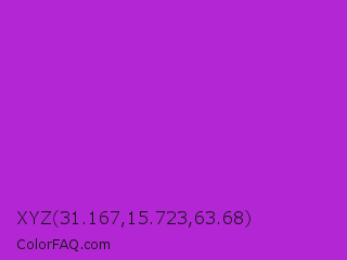XYZ 31.167,15.723,63.68 Color is a normal purple color and the nearest color is Steel Pink #cc33cc. Hex code #b326d4 and RGB value is rgb(179,38,212). In RGB color space, this color is composed of 70% red, 15% green, 83% blue, In CMYK color space, this color is composed of 16% cyan, 82% magenta, 0% yellow , 17% black , In HSL color space, this color has a hue angle of 289° , 70% saturation and 49% lightness.