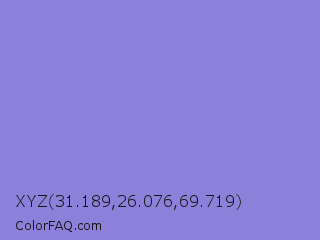 XYZ 31.189,26.076,69.719 Color is a light indigo color and the nearest color is Chetwode Blue #8581d9. Hex code #8c80da and RGB value is rgb(140,128,218). In RGB color space, this color is composed of 55% red, 50% green, 85% blue, In CMYK color space, this color is composed of 36% cyan, 41% magenta, 0% yellow , 15% black , In HSL color space, this color has a hue angle of 248° , 55% saturation and 68% lightness.