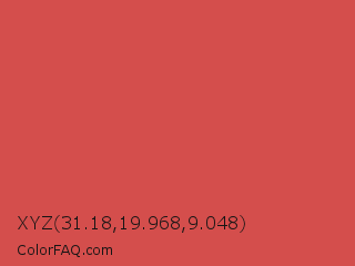 XYZ 31.18,19.968,9.048 Color is a normal red color and the nearest color is English Vermillion #cc474b. Hex code #d44e4c and RGB value is rgb(212,78,76). In RGB color space, this color is composed of 83% red, 31% green, 30% blue, In CMYK color space, this color is composed of 0% cyan, 63% magenta, 64% yellow , 17% black , In HSL color space, this color has a hue angle of 1° , 61% saturation and 56% lightness.