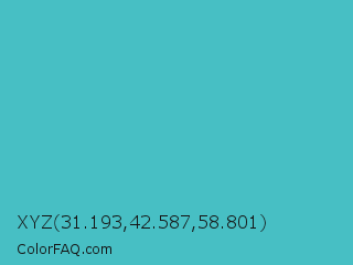 XYZ 31.193,42.587,58.801 Color is a normal cyan color and the nearest color is Sea Serpent #4bc7cf. Hex code #47bfc4 and RGB value is rgb(71,191,196). In RGB color space, this color is composed of 28% red, 75% green, 77% blue, In CMYK color space, this color is composed of 64% cyan, 3% magenta, 0% yellow , 23% black , In HSL color space, this color has a hue angle of 182° , 51% saturation and 52% lightness.