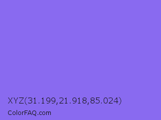 XYZ 31.199,21.918,85.024 Color is a light indigo color and the nearest color is Medium Slate Blue #7b68ee. Hex code #896af0 and RGB value is rgb(137,106,240). In RGB color space, this color is composed of 54% red, 42% green, 94% blue, In CMYK color space, this color is composed of 43% cyan, 56% magenta, 0% yellow , 6% black , In HSL color space, this color has a hue angle of 254° , 82% saturation and 68% lightness.