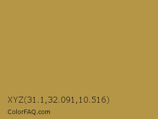 XYZ 31.1,32.091,10.516 Color is a normal orange color and the nearest color is Tussock #c5994b. Hex code #b59647 and RGB value is rgb(181,150,71). In RGB color space, this color is composed of 71% red, 59% green, 28% blue, In CMYK color space, this color is composed of 0% cyan, 17% magenta, 61% yellow , 29% black , In HSL color space, this color has a hue angle of 43° , 44% saturation and 49% lightness.