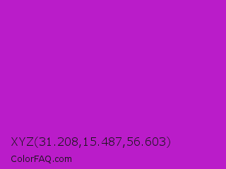 XYZ 31.208,15.487,56.603 Color is a normal magenta color and the nearest color is Steel Pink #cc33cc. Hex code #ba1cc9 and RGB value is rgb(186,28,201). In RGB color space, this color is composed of 73% red, 11% green, 79% blue, In CMYK color space, this color is composed of 7% cyan, 86% magenta, 0% yellow , 21% black , In HSL color space, this color has a hue angle of 295° , 76% saturation and 45% lightness.