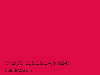 XYZ 31.216,16.14,6.624 Color is a normal rose color and the nearest color is Crimson #dc143c. Hex code #de0a42 and RGB value is rgb(222,10,66). In RGB color space, this color is composed of 87% red, 4% green, 26% blue, In CMYK color space, this color is composed of 0% cyan, 95% magenta, 70% yellow , 13% black , In HSL color space, this color has a hue angle of 344° , 91% saturation and 45% lightness.