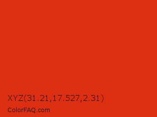 XYZ 31.21,17.527,2.31 Color is a normal red color and the nearest color is Vermilion #d9381e. Hex code #de2e12 and RGB value is rgb(222,46,18). In RGB color space, this color is composed of 87% red, 18% green, 7% blue, In CMYK color space, this color is composed of 0% cyan, 79% magenta, 92% yellow , 13% black , In HSL color space, this color has a hue angle of 8° , 85% saturation and 47% lightness.